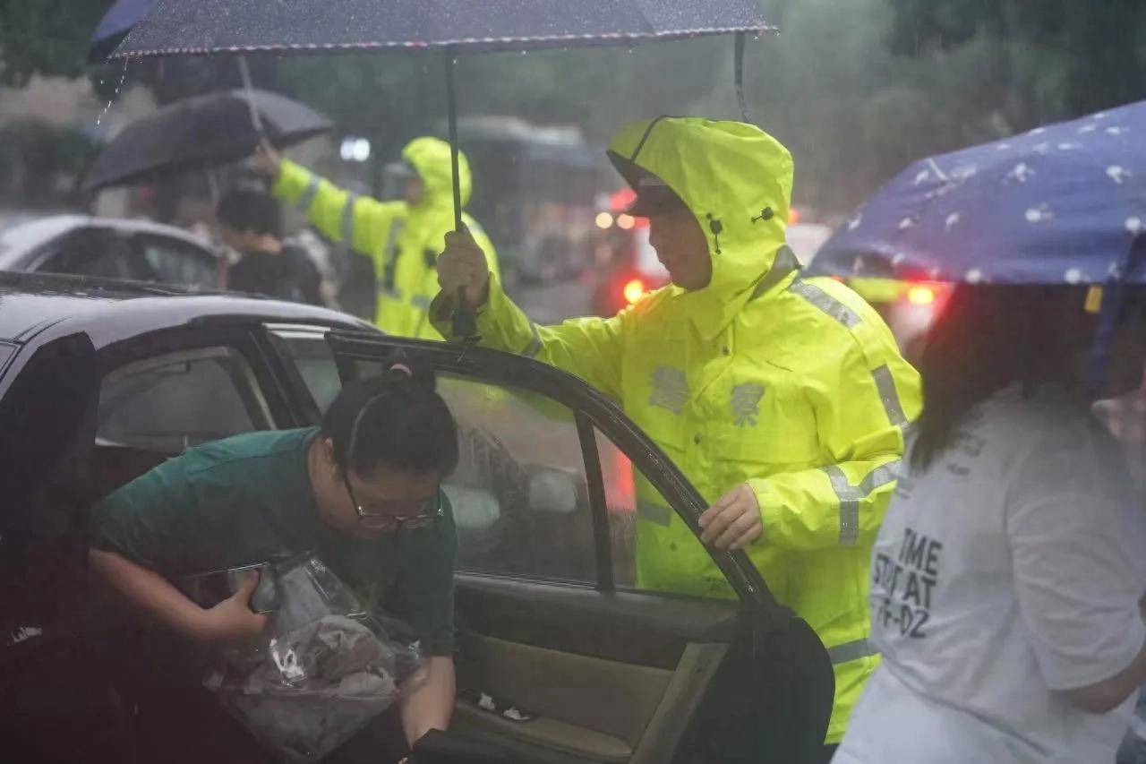 积水处,他们背起考生蹚过水洼;紧急时,他们冒雨骑行火速送考;考点外,他们定点值守护考保畅……